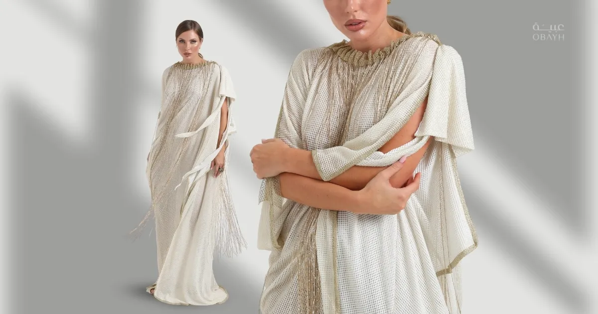 إذا كنتِ تبحثين عن التفرّد خلال السهرة فإن جلابية الحرير المزينة بشراشيب الذهب هي خيارك المثالي، بتصميمها الأنيق وأكمامها الغير متماثلة تمنحك إطلالة فاخرة تعكس ذوقك الرفيع.